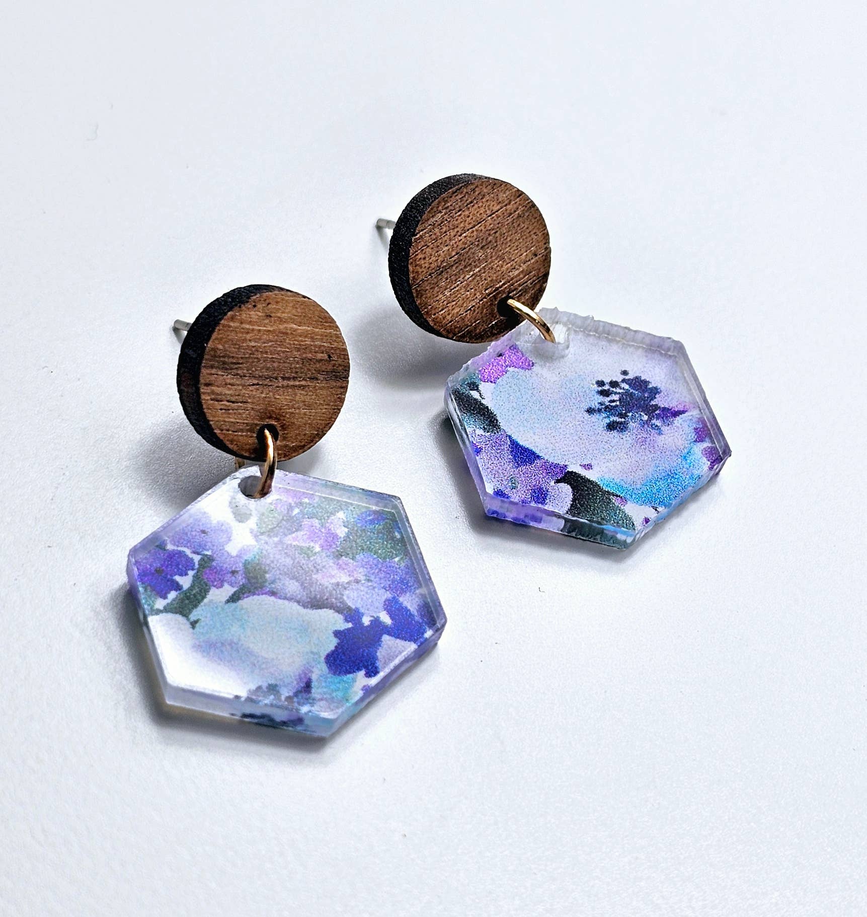 Blue Floral Acrylic Earring Dangle with a walnut wood stud topper.